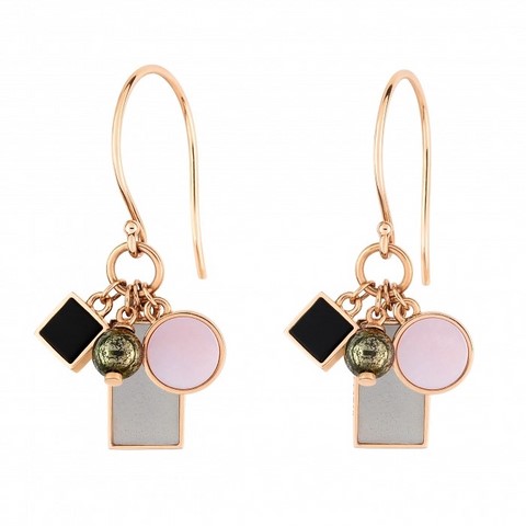 - 18 carat rose gold earrings with grey moonstone, pink mother of pearl, onyx and pyrite
